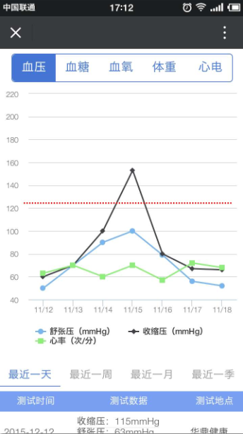 n 下方為監(jiān)測信息的表格,包括測量時(shí)間、測量數(shù)據(jù)和測量地點(diǎn);可以按標(biāo)題排序;可以分別查看最近一天/一周/一月/一季的數(shù)據(jù)(如下圖)。